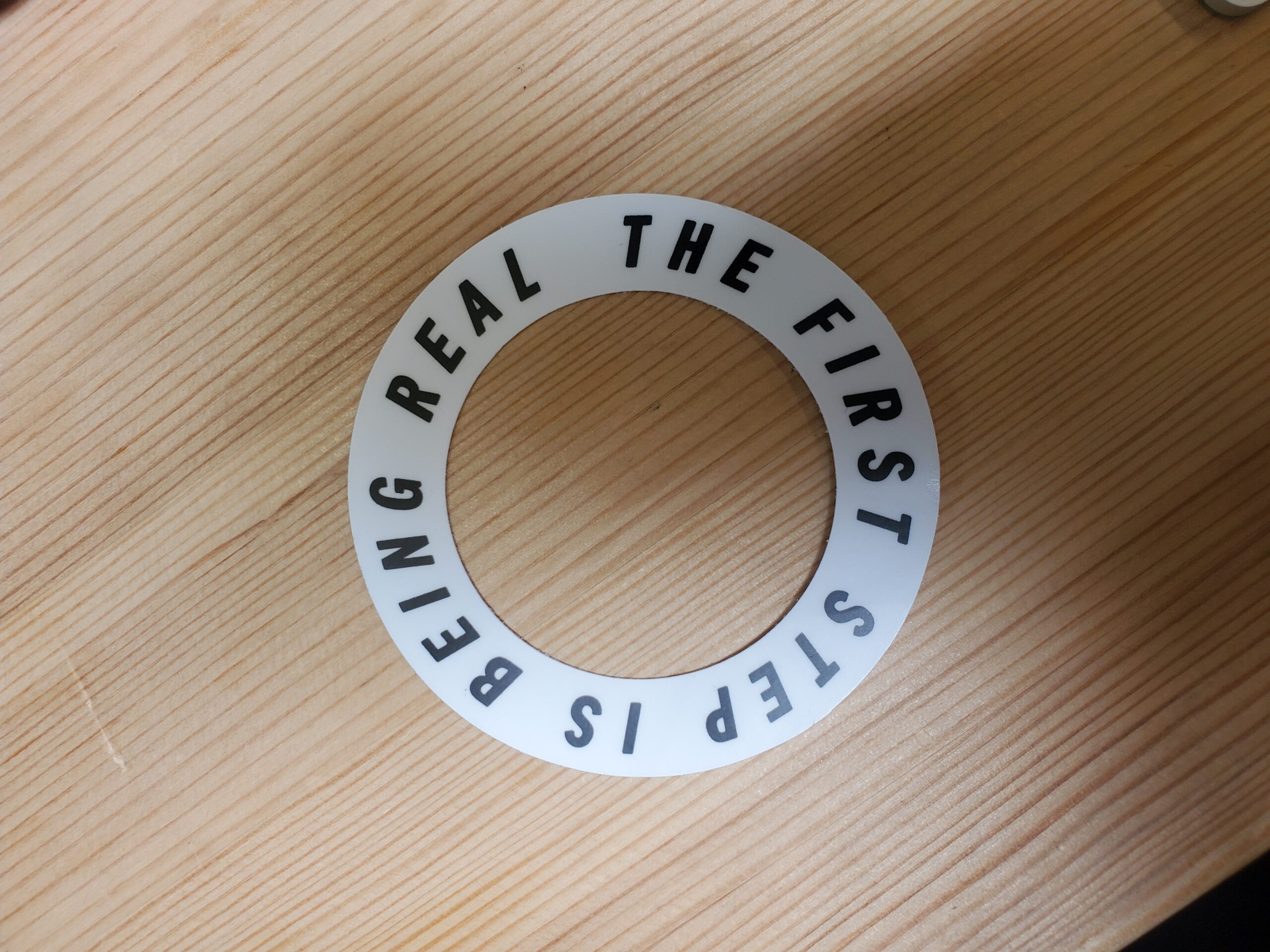 3 inch round white sticker with 2 inch cutout in the center.